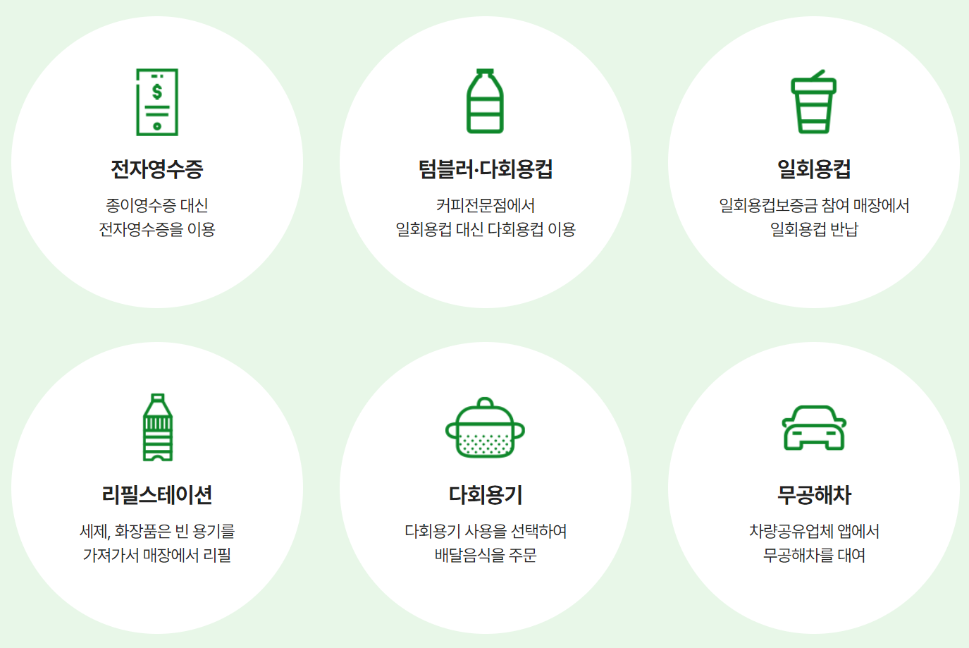 녹색생활로 인정되는 종류는 아래와 같이 다양합니다. 전자영수증 발급, 텀블러/다회컵 이용, 일회용컵 반납, 리필스테이션 이용, 무공해차 대여, 친환경제품 구매 등 다양하게 자신에게 맞는 방법으로 실천할 수 있으며 어렵지 않으니 지금 바로 진행해보세요.