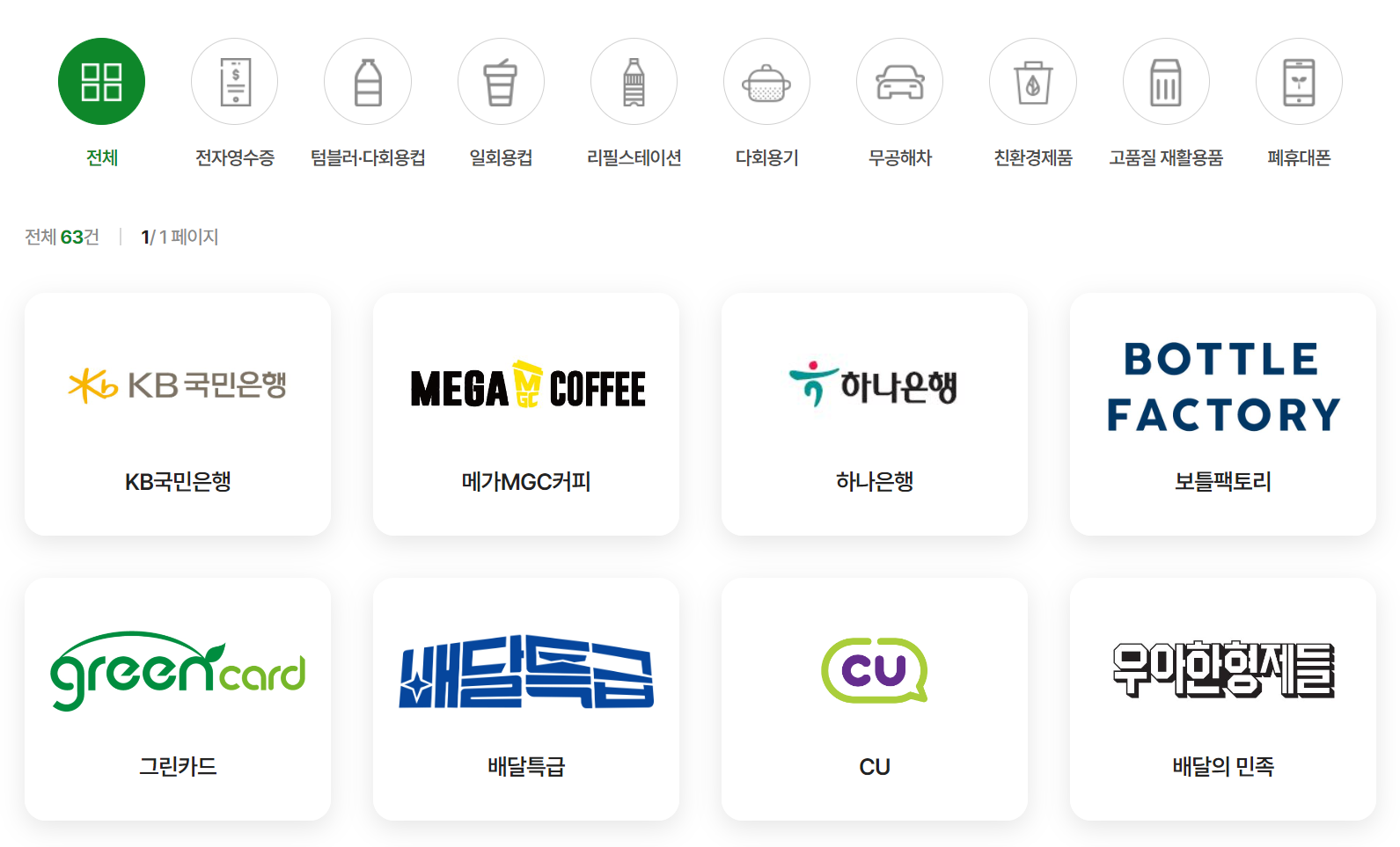 현재 탄소중립 실천포인트제 참여기업은 총 63개의 기업으로 굉장히 많은 업체가 참여하고 있습니다. 스타벅스, 폴바셋, 메가커피, CU, 세블일레븐, S-OIL, 홈플러스, 이마트, 쿠팡이츠, 배달의 민족, 국민은행 등 언제 어디서나 어렵지 않게 진행할 수 있도록 많은 업체가 참여하고 있으니 바로 실천해보세요. 더 많은 참여기업은 아래에서 확인 가능합니다.