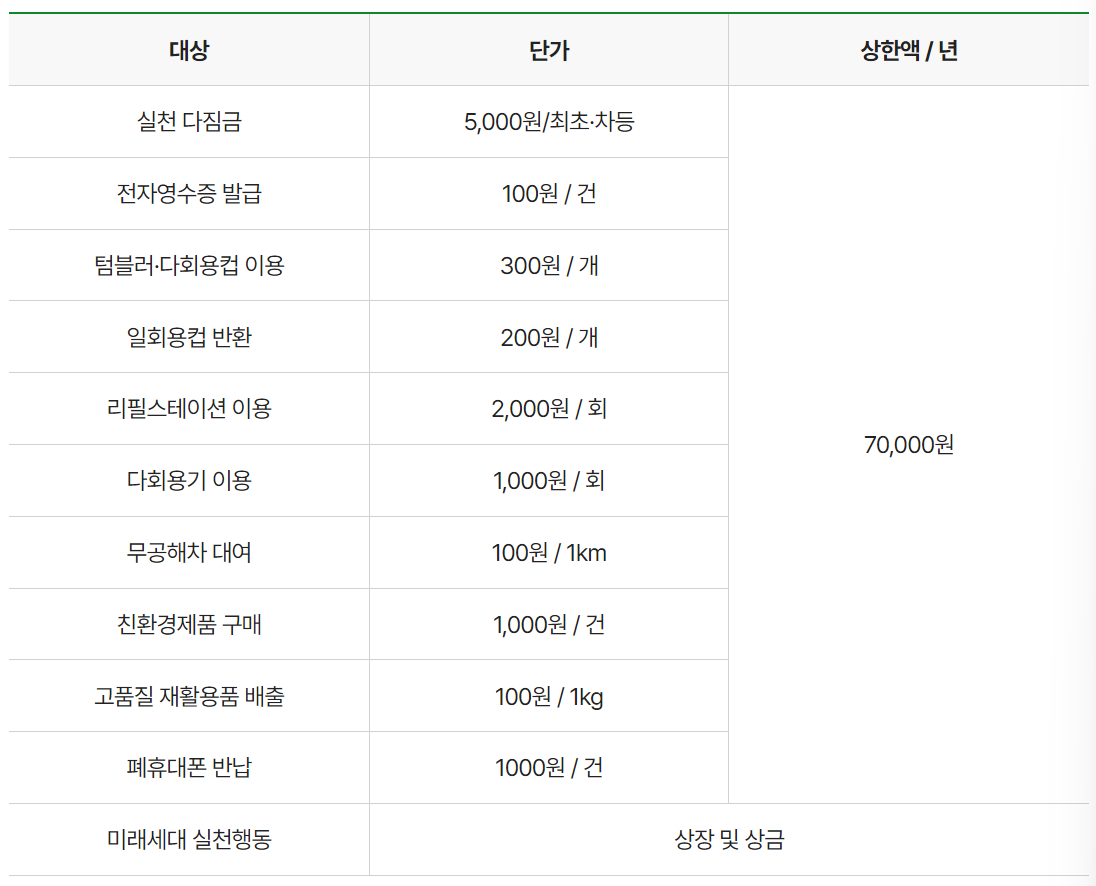 녹색생활 실천활동에 따른 인센티브 단가는 아래와 같으며, 1년에 최대 7만원까지 지급됩니다.