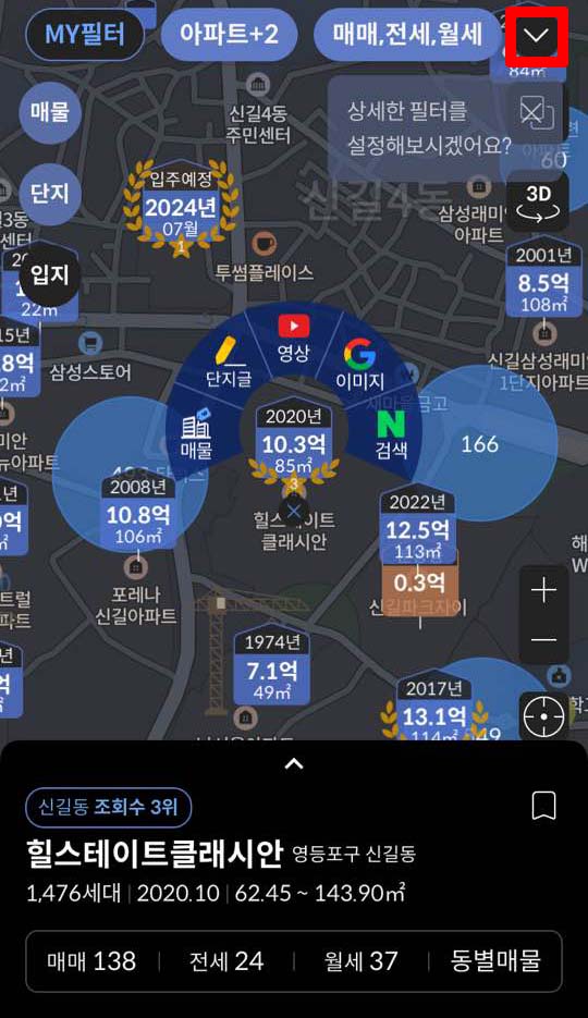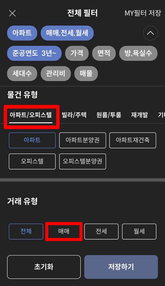 ② [아래 화살표 버튼(전체필터)]에서 세부 사항(매매, 전세, 매매가, 면적, 준공연도 등] 조건 검색