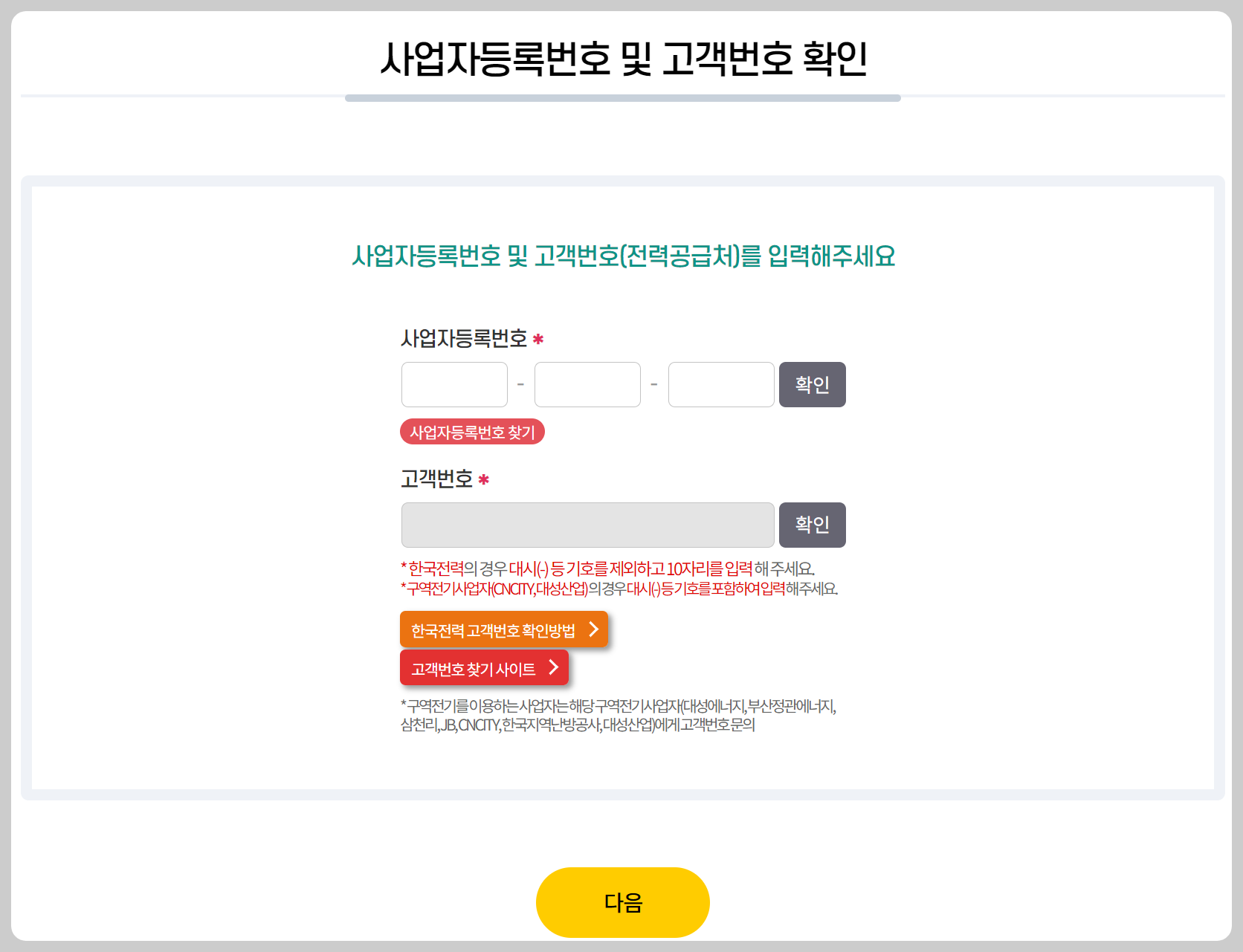 ⑤ 사업자등록번호, 고객번호 입력하면 완료