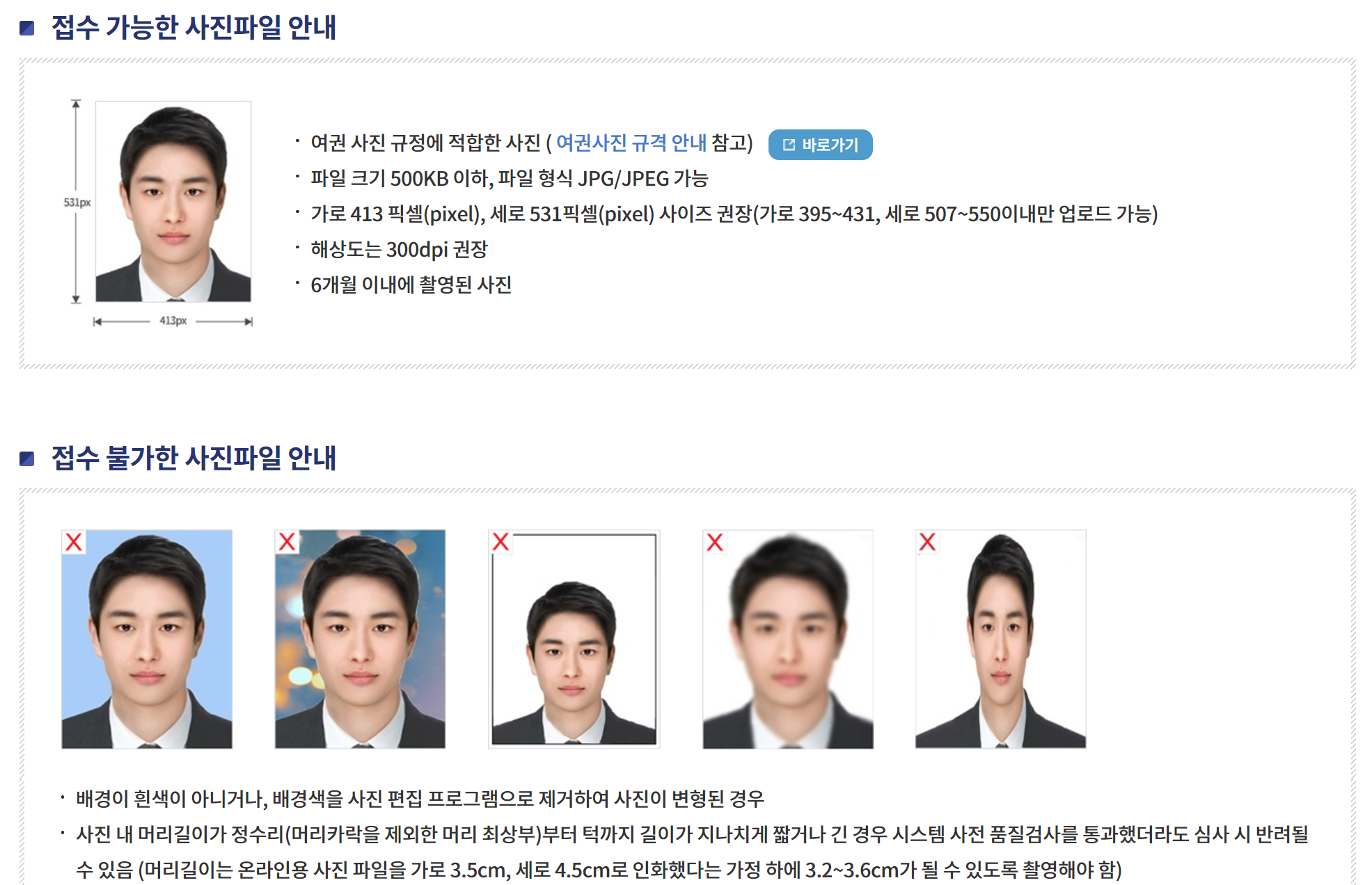 또한 배경이 흰색이 아니거나, 배경색을 사진 편집 프로그램으로 제거하여 사진이 변형된 경우, 해상도가 낮거나 흐릿한 경우, 얼굴 좌우 또는 상하로 납작하게 변형된 경우 등 모두 부적합하오니 규격을 확인하고 업로드하시기 바랍니다.
