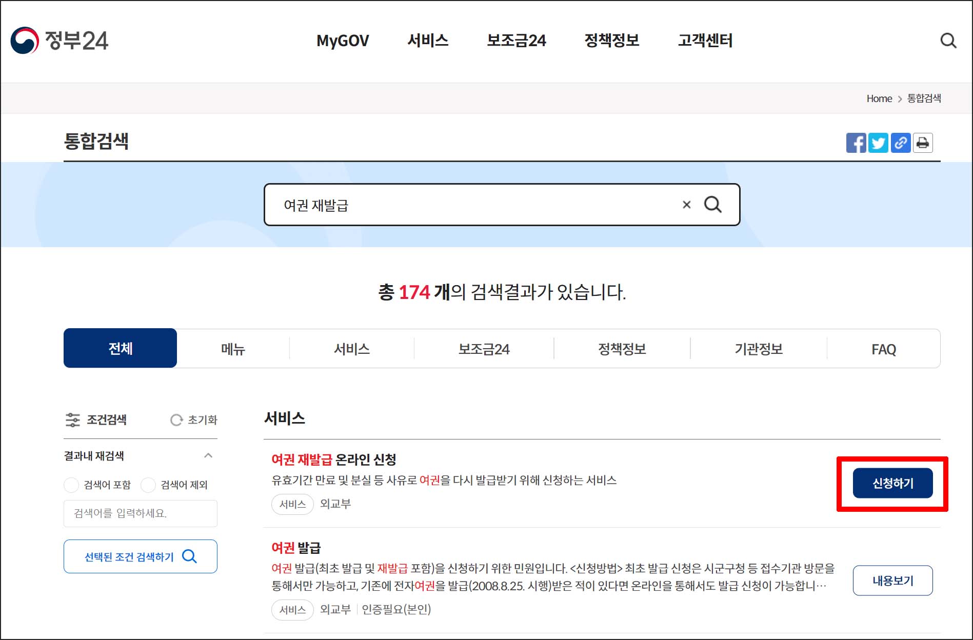 ② 여권 재발급 [신청하기] 버튼 클릭