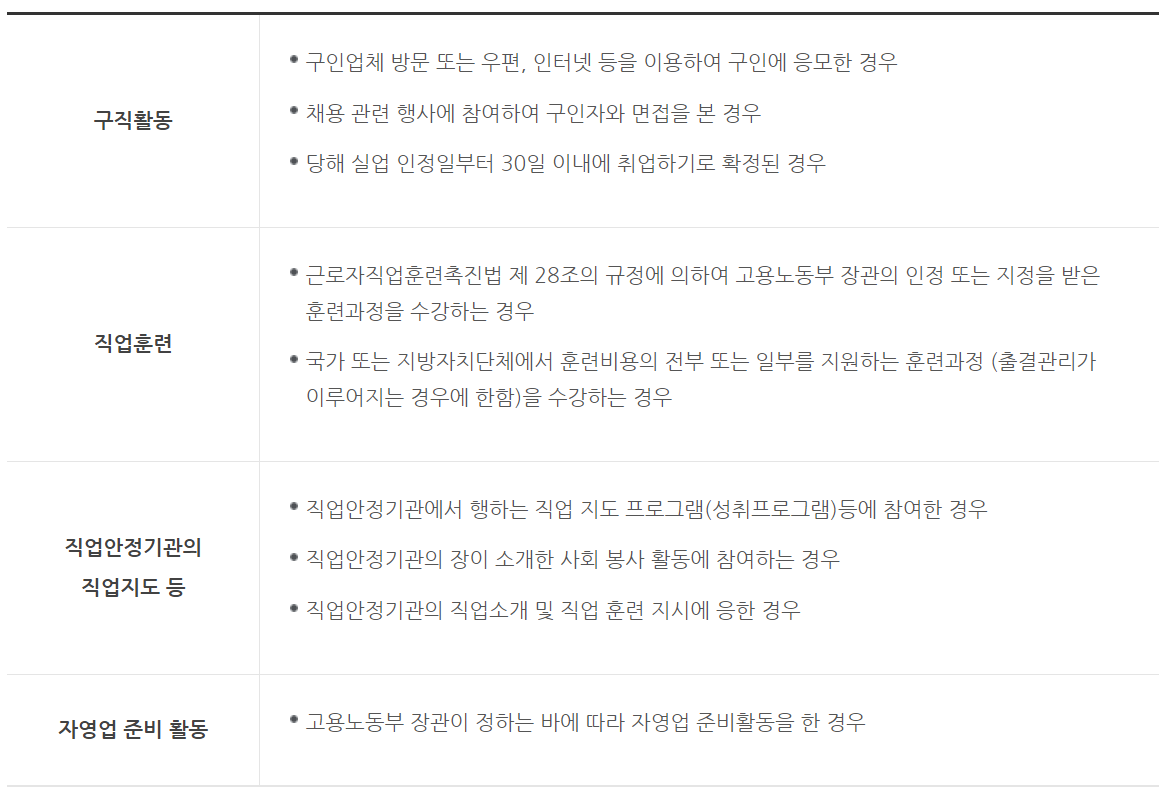 재취업을 위한 적극적인 노력으로 인정받을 수 있는 경우는 크게 구직활동, 직업훈련, 직업안정기관의 직업지도, 자영업 준비 활동 등 4가지로 분류합니다. 구직활동 외, 직업훈련을 받고 직업 지도 프로그램에 참여하는 등의 활동도 재취업활동에 포함되니 다양한 형태로 재취업활동 진행하시기 바랍니다.