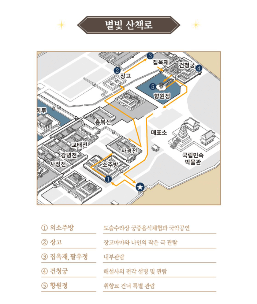 - 행사내용 : 경복궁 소주방 궁중음식체험과 경복궁 북측권역 전각에 대한 해설을 들으며, 경복궁의 역사·문화·조경 등을 체험할 수 있는 야간 기행