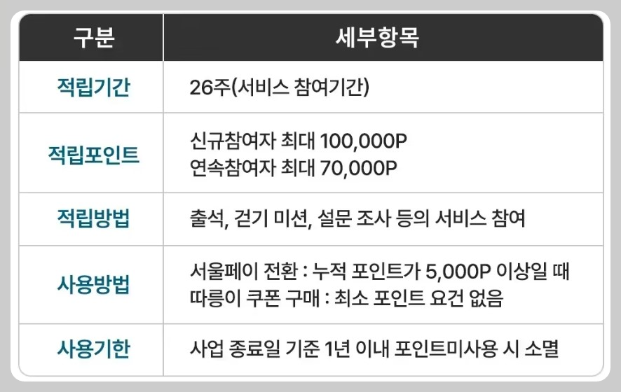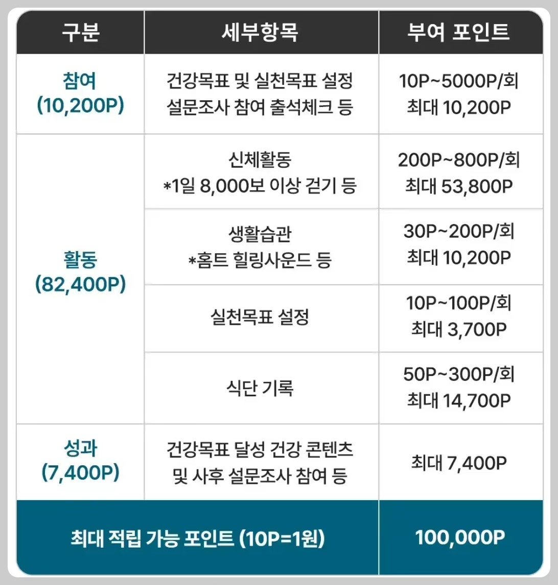 - 활동(최대 88,200P) : 1일 8,000보 이상 걷기, 식단 기록, 건강 콘텐츠 참여 등