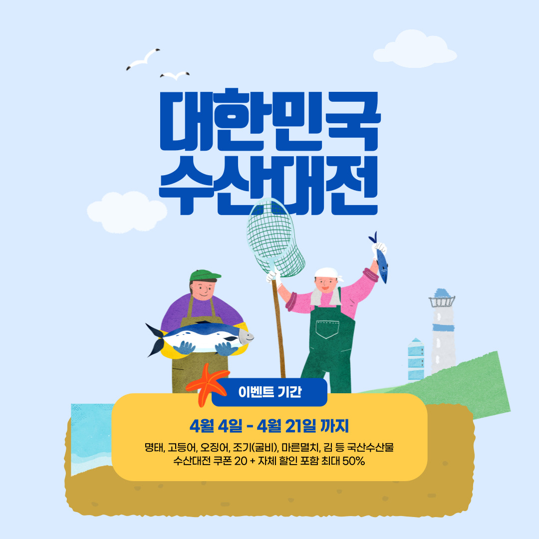 4월 4일부터 4월 21일까지 진행되는 [4월 수산인의 날] 행사는 27개의 온라인 업체가 참여하며, 쿠폰을 통해 저렴하게 수산물을 구매하실 수 있습니다. 선착순이므로 아래에서 서둘러 신청하시기 바랍니다.