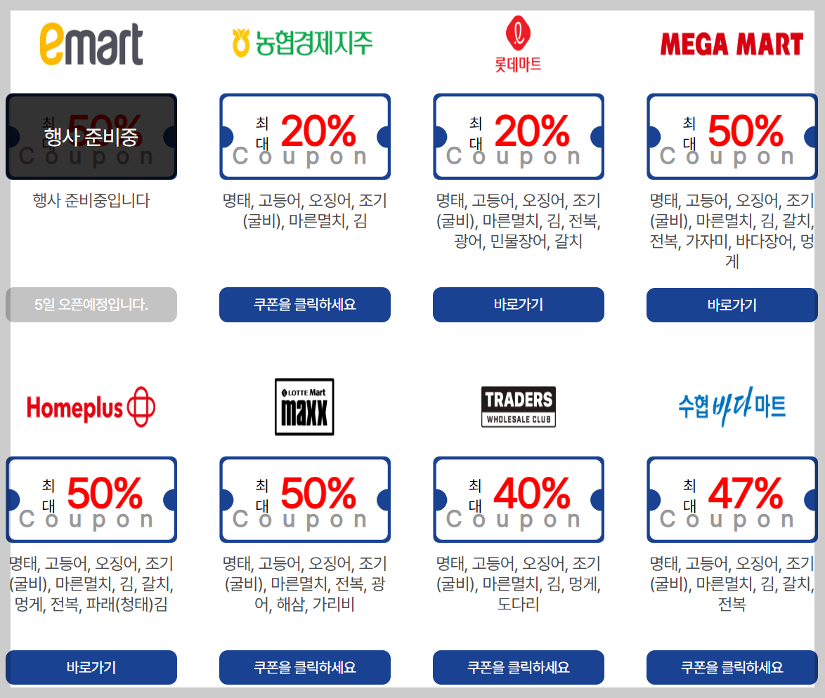 SSG.COM, 공영홈쇼핑, 수협쇼핑, TOMATO, 티몬, 11번가, 롯데백화점, OASIS, 우아한 형제들, 마켓컬리, 카카오톡 쇼핑, 농협몰, 쿠팡, AK몰, 비비수산, 캐시워크, NS홈쇼핑, 훈훈수산, 위메프, Hmall, LG헬로비전, 우체국쇼핑, SK스토아, 핵이득마켓, 파도상자, 8팔도감, GS SHOP