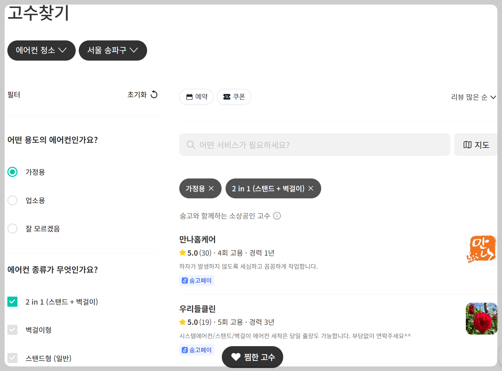 여러 업체의 견적을 받기보다, 믿을만한 고수에게 직접 의뢰하시고 싶으신 분들은 아래버튼으로 바로 이동하세요. [고수 찾기] 서비스에서는 내 주변지역 에어컨 청소업체들을 리뷰가 많은 순으로 꼼꼼히 확인하고, 해당 업체를 지정하여 직접 의뢰할 수도 있습니다. 에어컨 청소를 기간을 가지고 믿을만한 업체에 여유롭게 진행하실 분들은 해당 서비스를 이용해보시는 것도 좋습니다.