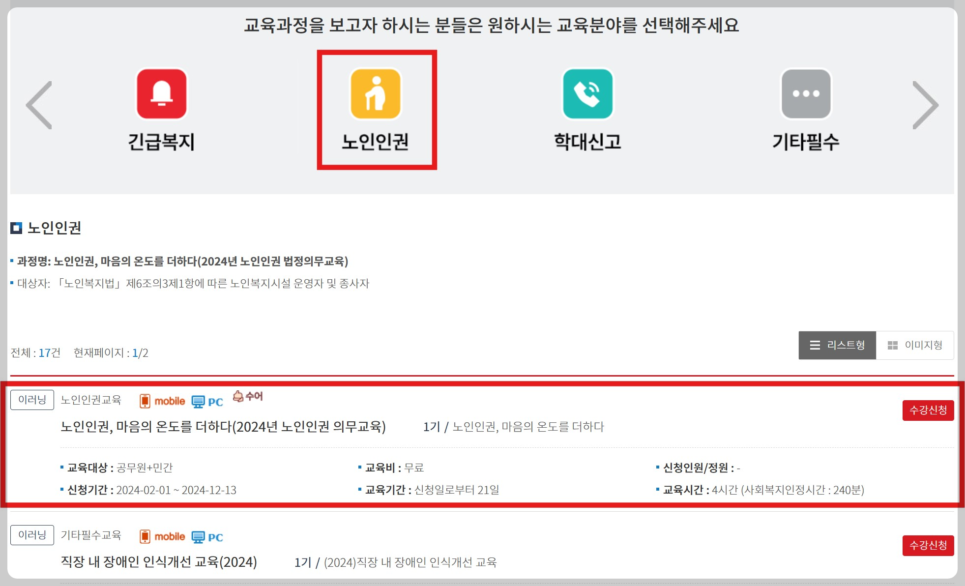 4. [노인인권, 마음의 온도를 더하다] 교육, 빨간색 [수강신청] 버튼 클릭하면 완료