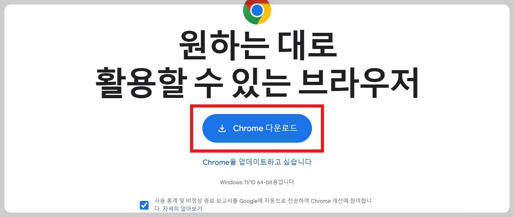 노인인권교육 동영상 재생을 위해서는 크롬 브라우저 사용이 필수입니다. 인터넷 익스플로러는 오류 발생, 영상 끊김 등의 문제가 발생하고 있으므로 현재 크롬 브라우저를 사용하고 계시지 않다면 아래 사이트에 접속해서 크롬 설치 파일을 다운로드 후 실행하시기 바랍니다.