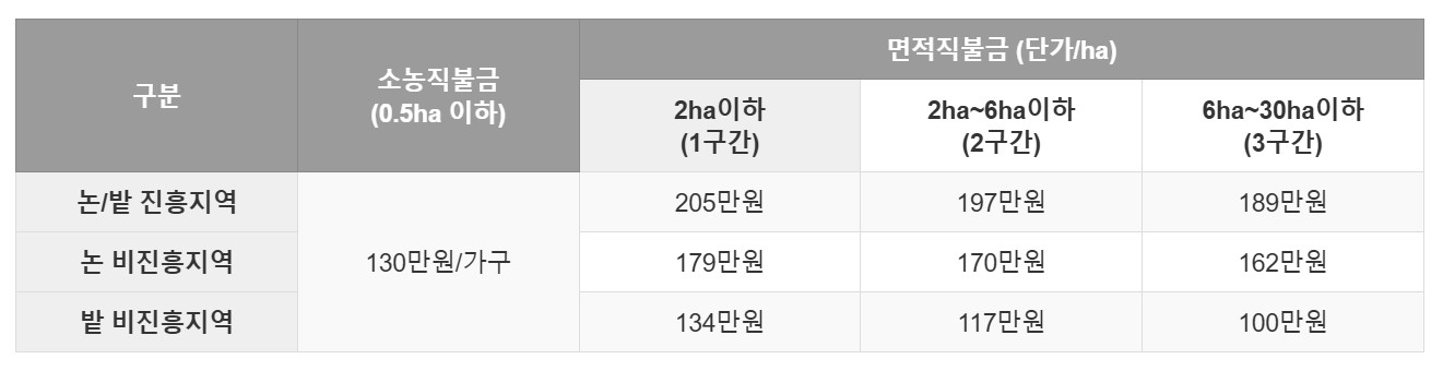 2) 면적직불금 : 면적직불금은 품목에 관계없이 면적에 따라 논/밭, 진흥/비진흥 지역을 구분하여 직불금이 지급되며, 위의 소농직불금 요건을 충족하지 않고 기본적인 지급요건을 충족하는 경우 면적직불금 지급대상이 됩니다.