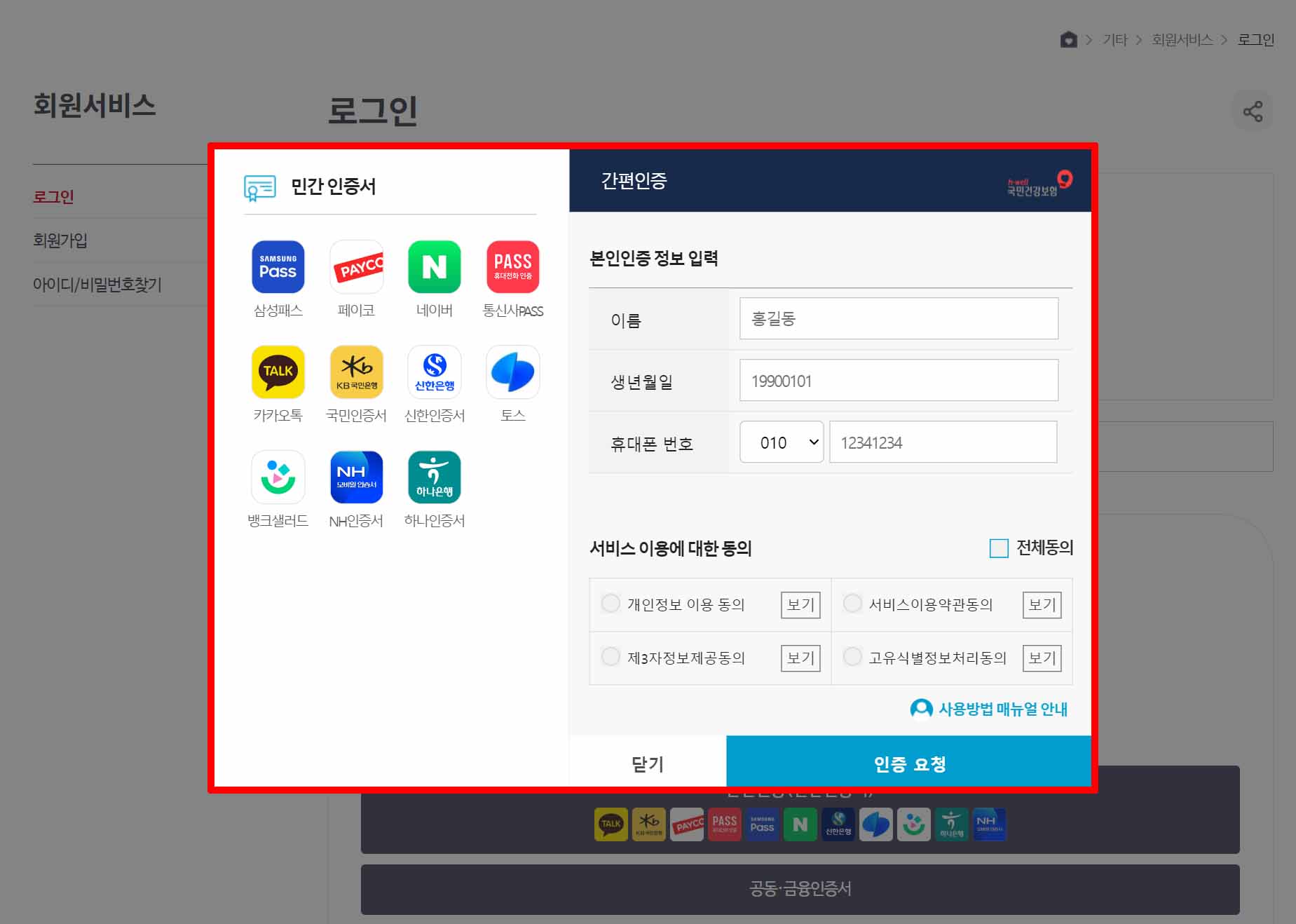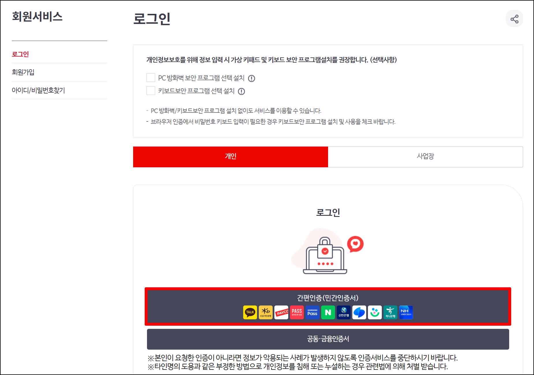3. 로그인 방법 선택 (간편 인증 or 공동, 금융인증서)