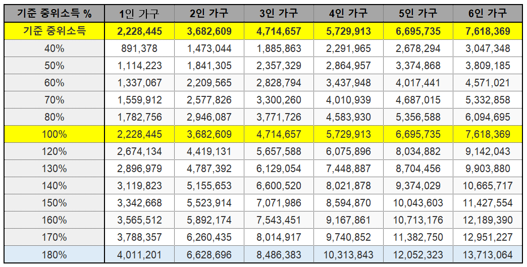 정부가 매년 여러 경제지표를 반영하여 가구원수별로 국민 가구소득의 중간값을 발표하는데, 이러한 기준 중위소득은 기초생활보장제도를 비롯한 각종 복지사업 등의 수급자 선정하는 기준으로 활용됩니다.