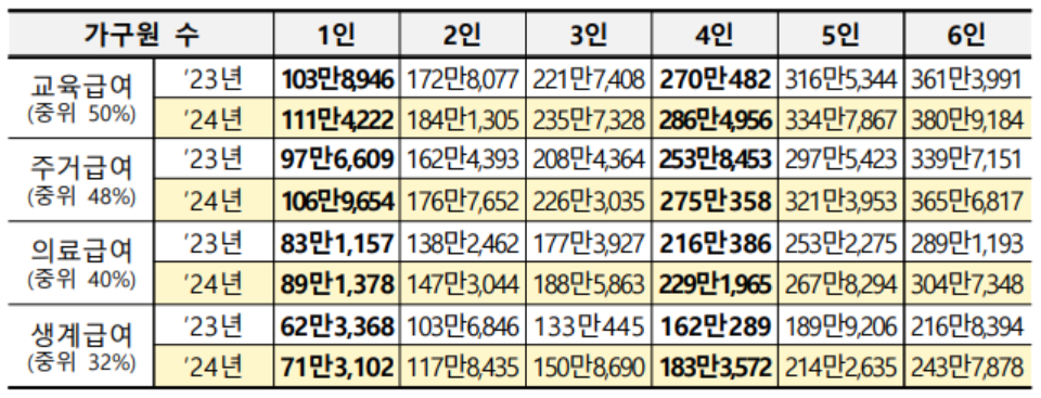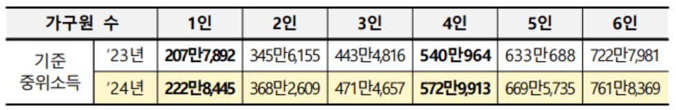 중앙생활보장위원회에서 발표한 가구원 수에 따른 2024년 기준 중위소득은 아래와 같습니다.