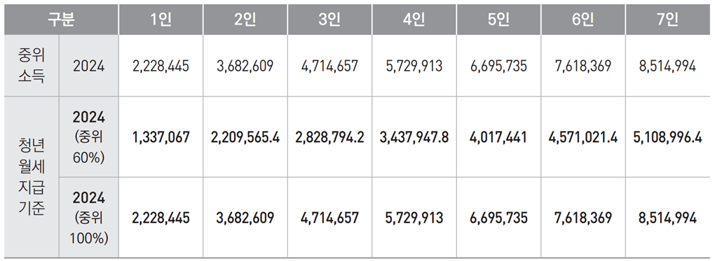 | 청년가구 | 중위소득 60% 이하 | 1.22억원 이하 |